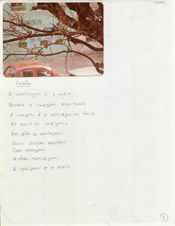 Há muitos e muitos anos (e põe ano nisso…) eu tinha como hobby a fotografia. Escrever era só um complemento. Resolvi fazer um pequeno texto para algumas fotos que achava terem um conteúdo significativo. Pensei em fazer um pequeno livro com essas fotos e esses textos. O título seria “Mensagem é meio e imagem”. Nunca passei dos manuscritos. Achei as folhas no baú em que andei mexendo outro dia. Decidi publicar na forma em que estão. Mas estou apanhando um pouco da tecnologia. Então vai aos poucos. É um material inédito. Até hoje só eu e a Fabiana, minha psicanalista, tínhamos visto este material. Então, prepare-se para ver um pouco da minha alma.
